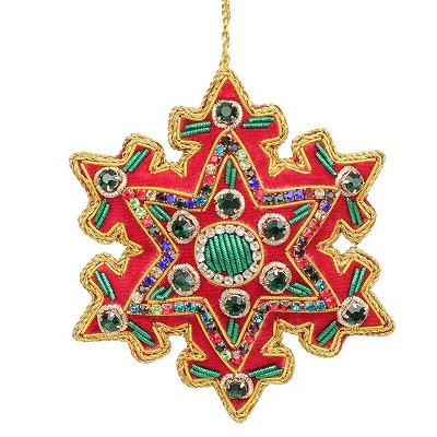Ornate zardozi embroidered star ornament in reds and gold.