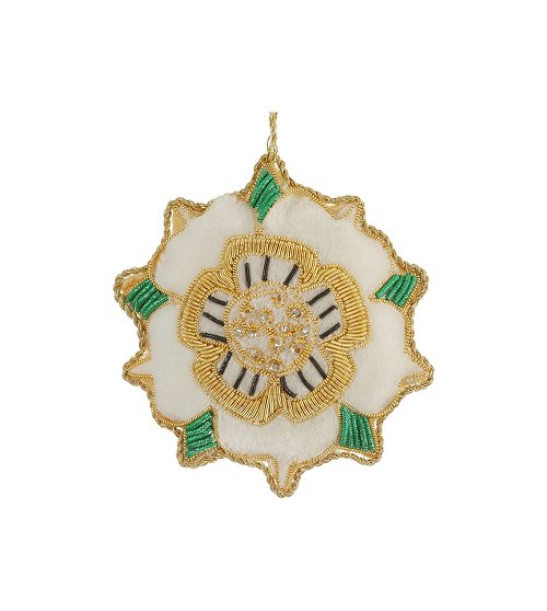 The Tudor Rose, with its red (and pinkish center) combination, symbolizes the end of the Wars of the Roses and the union of the House of Lancaster (red rose) and the House of York (white rose). Back of the ornament is a solid red.